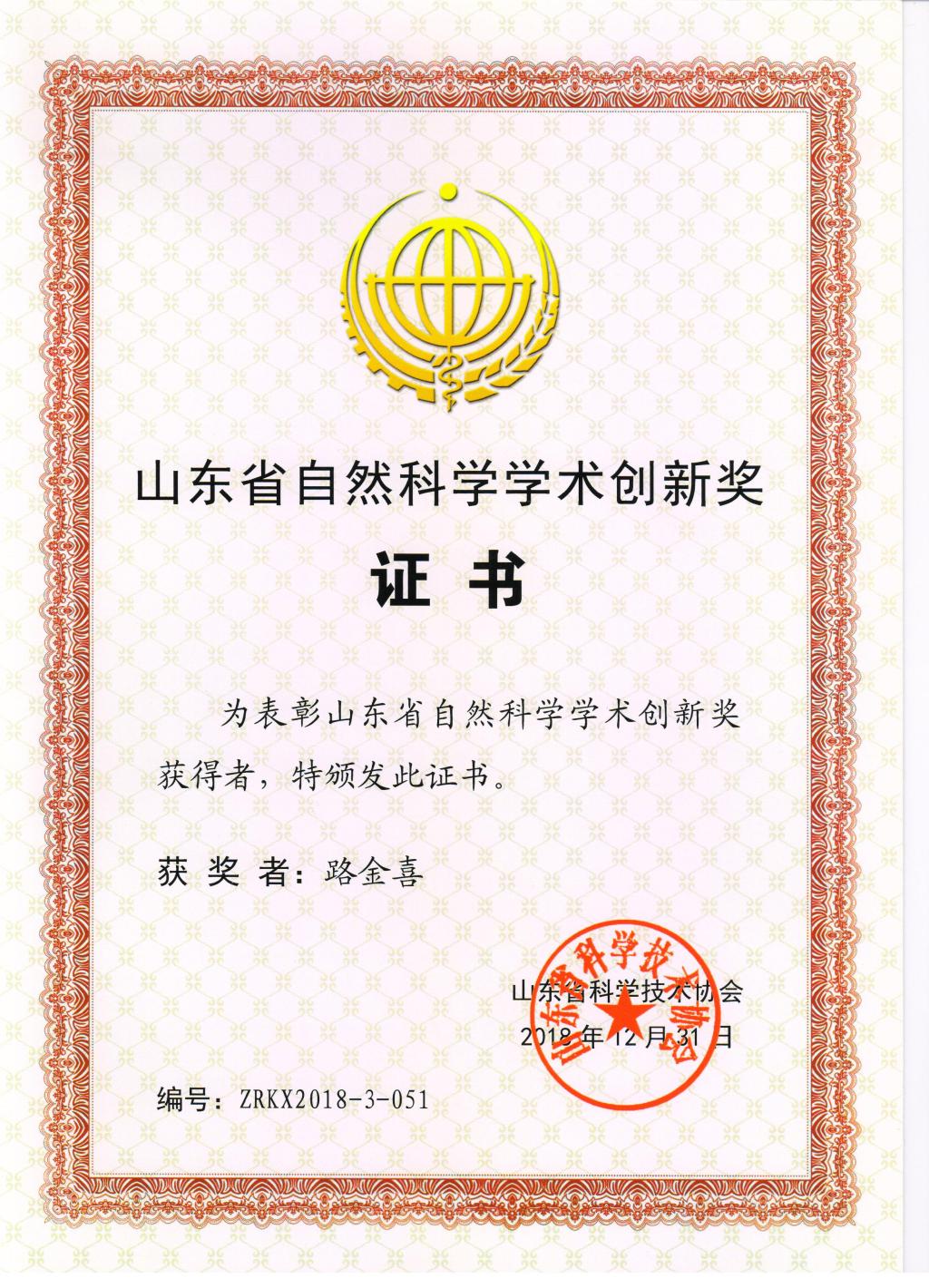 我院路金喜教授获得2018年山东省自然科学学术创新奖