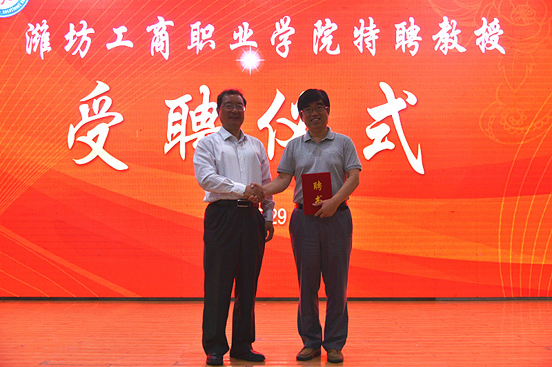潍坊工商职业学院院长王传旭同志向李贻斌教授颁发聘书